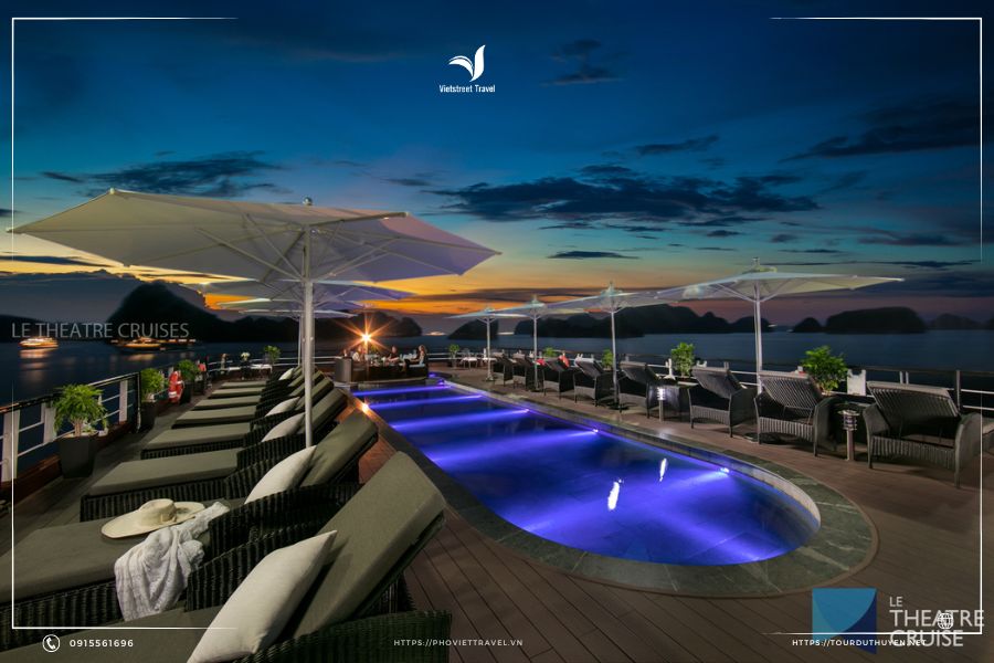 Đặc biệt - điểm nhấn kiệt tác tuyệt vời đó là Bể bơi Mini lộ thiên tập thể ngoài trời. Quý khách hãy tưởng tượng cảm giác ngâm mình trong làn nước ngọt mát lạnh, trên một siêu du thuyền Le theatre 5 sao lênh đênh trên vịnh Hạ Long, nhâm nhi ly rượu vang/ cocktails, ngắm nhìn hoàng hôn hay khi bình minh, cảm nhận những thanh âm yên bình và trong lành của tự nhiên.