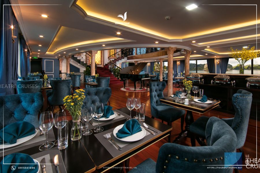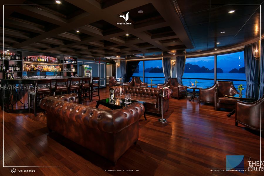 Hệ thống nhà hàng Le theatre cruise, quầy bar thiết kế theo phong cách Châu Âu, cực kỳ khoa học, thoáng mà ấm cúng. Chúng tôi cung cấp và phục vụ tất cả các loại đồ uống nổi tiếng trên thế giới từ nước ngọt, các loại vang và các loại rượu mạnh.