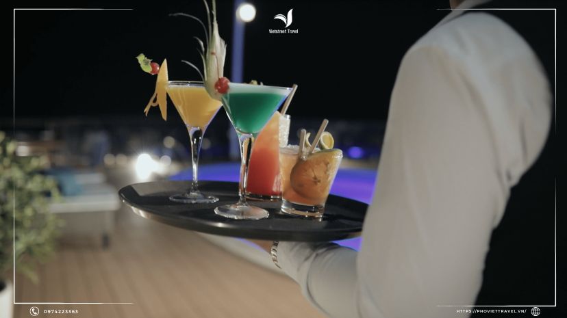 17:30 Du khách tự do nghỉ ngơi ở trên không gian chung của tàu hoặc trong phòng với một ly cocktail và ngắm hoàng hôn trên Vịnh Bắc Bộ, tham gia lớp học nấu món ăn truyền thống.